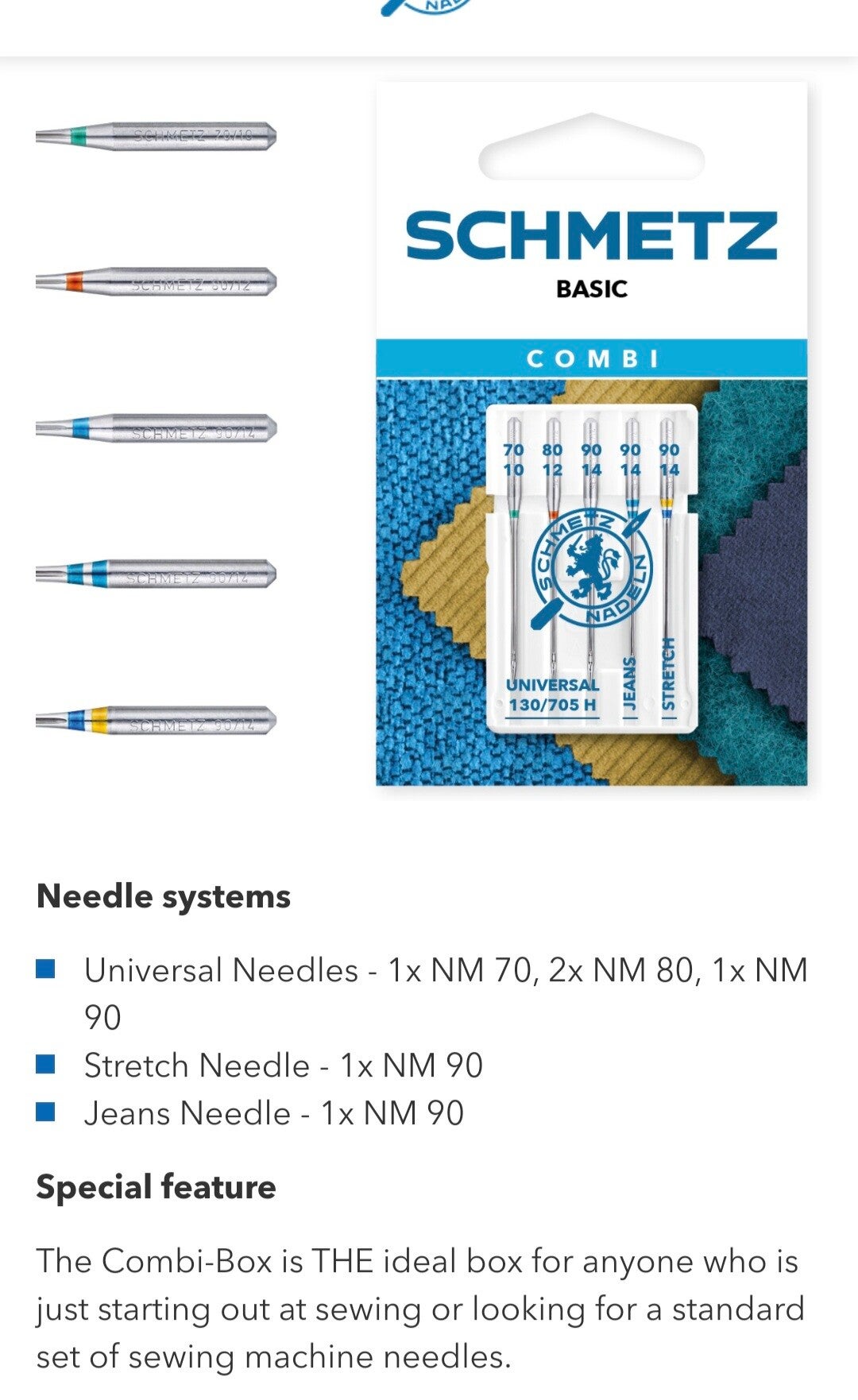 The Schmetz Basic Combi Pack includes: 3x Universal Needles: 70(10), 80(12), 90(14); 1x Denim Needle: 90(14); and 1x Stretch Needle: 90(14). The universal needle is great for all purpose use, the stretch needle for jersey or other elasticated fabrics and the Denim needle for thicker fabrics.