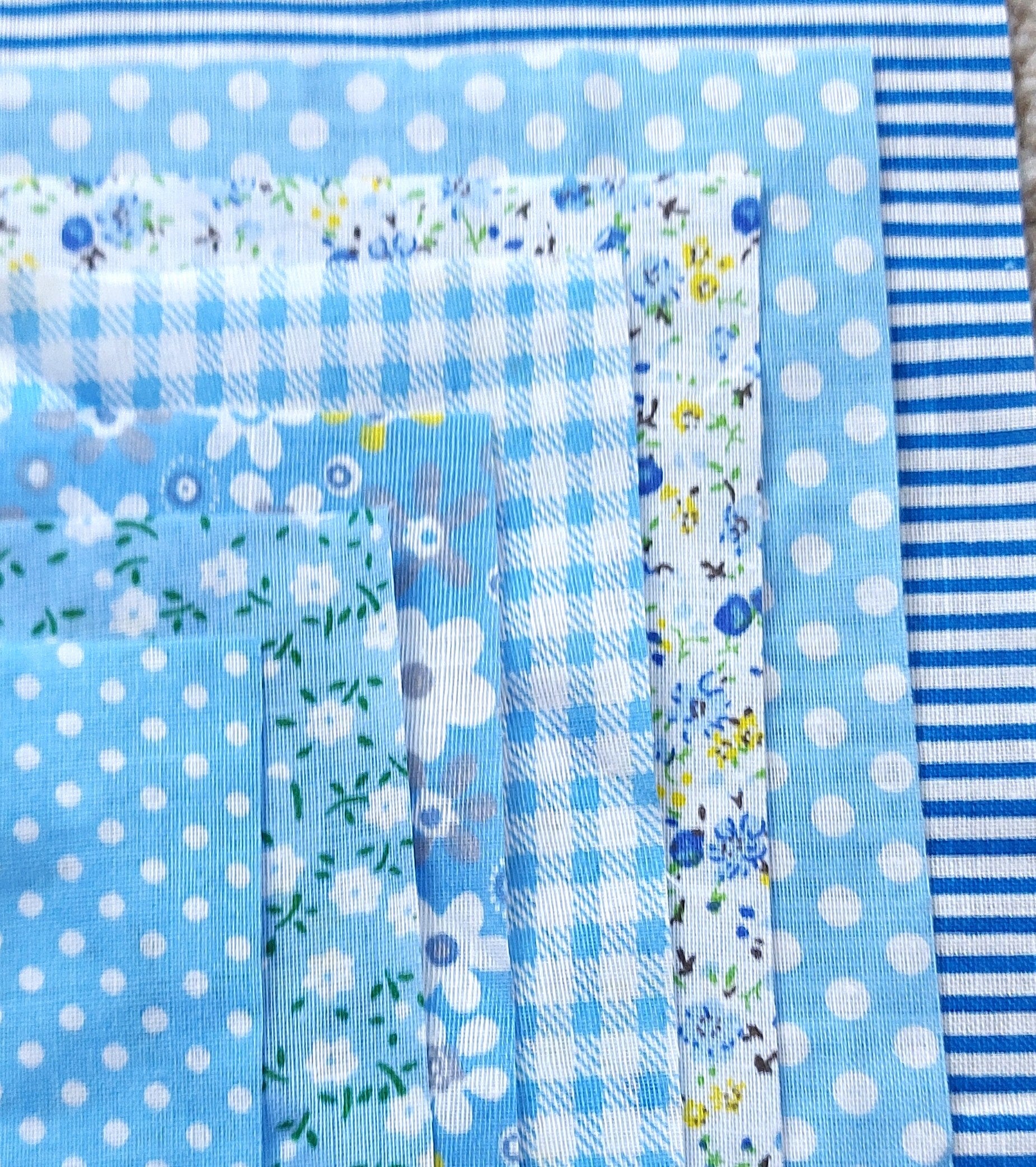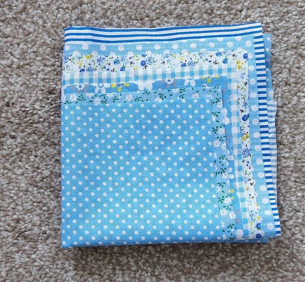 Light Blues 25cm x 25cm Cotton Fabric. 7 Pieces