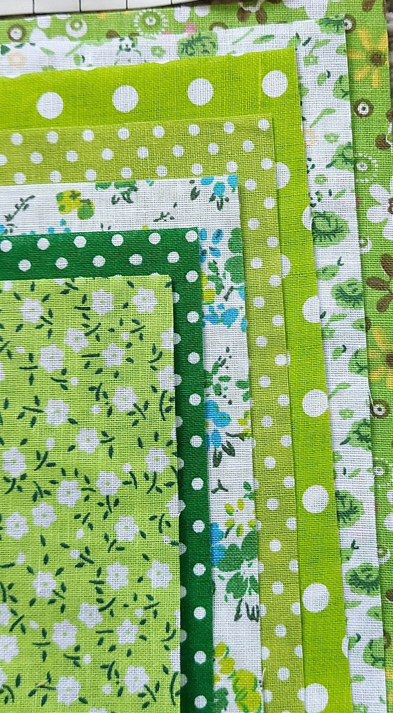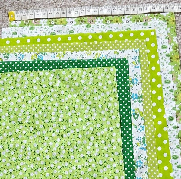 Greens 25cm x 25cm Cotton Fabric. 7 Pieces