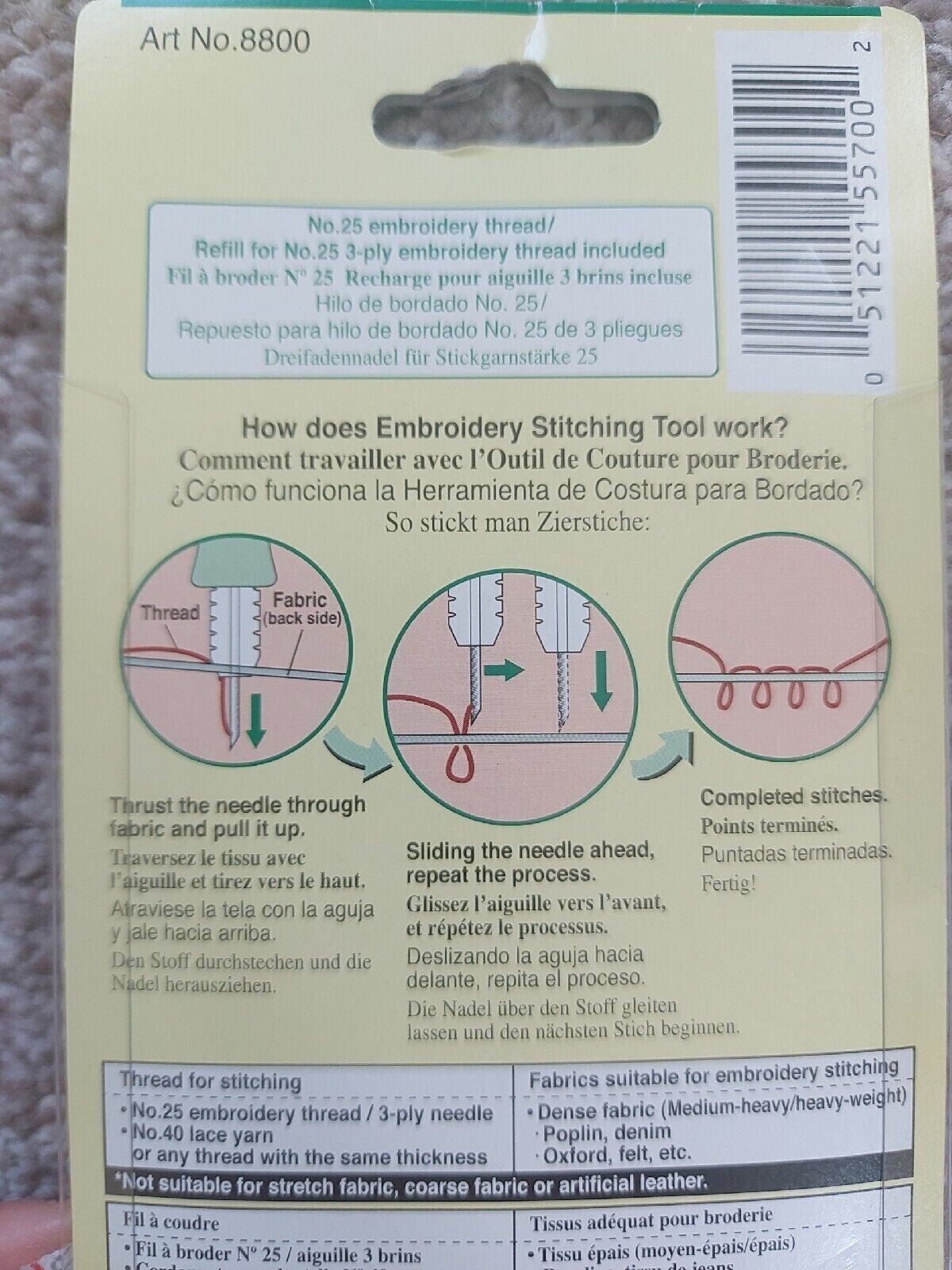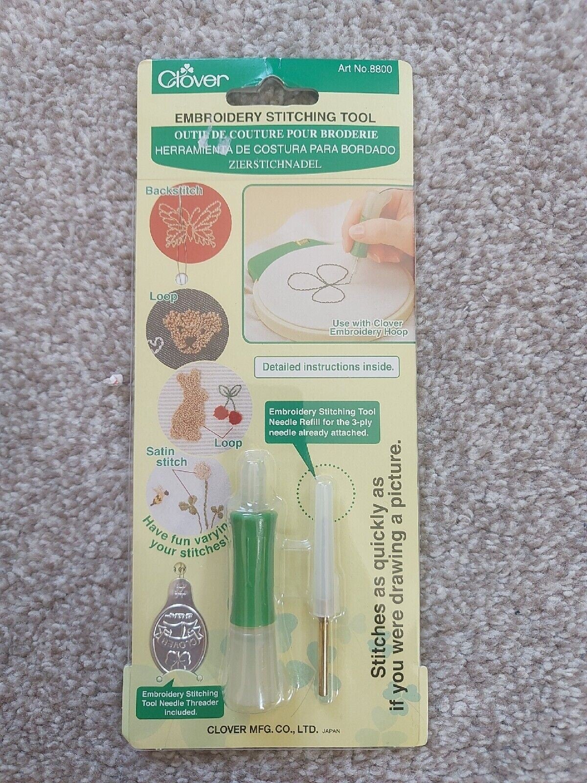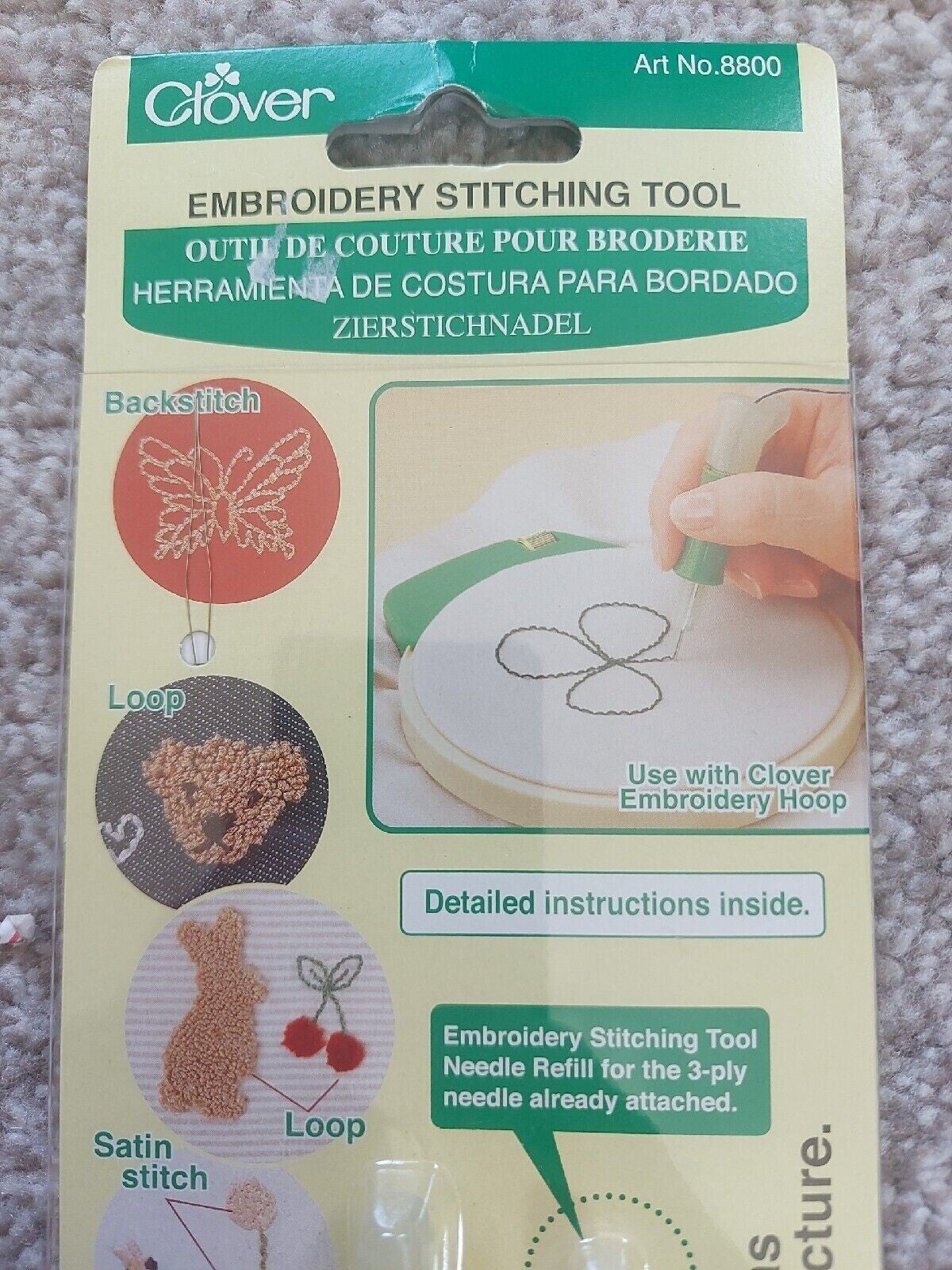 Clover-Embroidery Stitching Tool. This tool stitches as quickly as if you were drawing a picture. Simply thrust The Needle through The fabric and pull it up; slide The Needle ahead and repeat The process. This package contains embroidery Stitching tool; embroidery Stitching tool Needle; refill embroidery Stitching tool Needle; Needle threader and complete instructions with diagrams